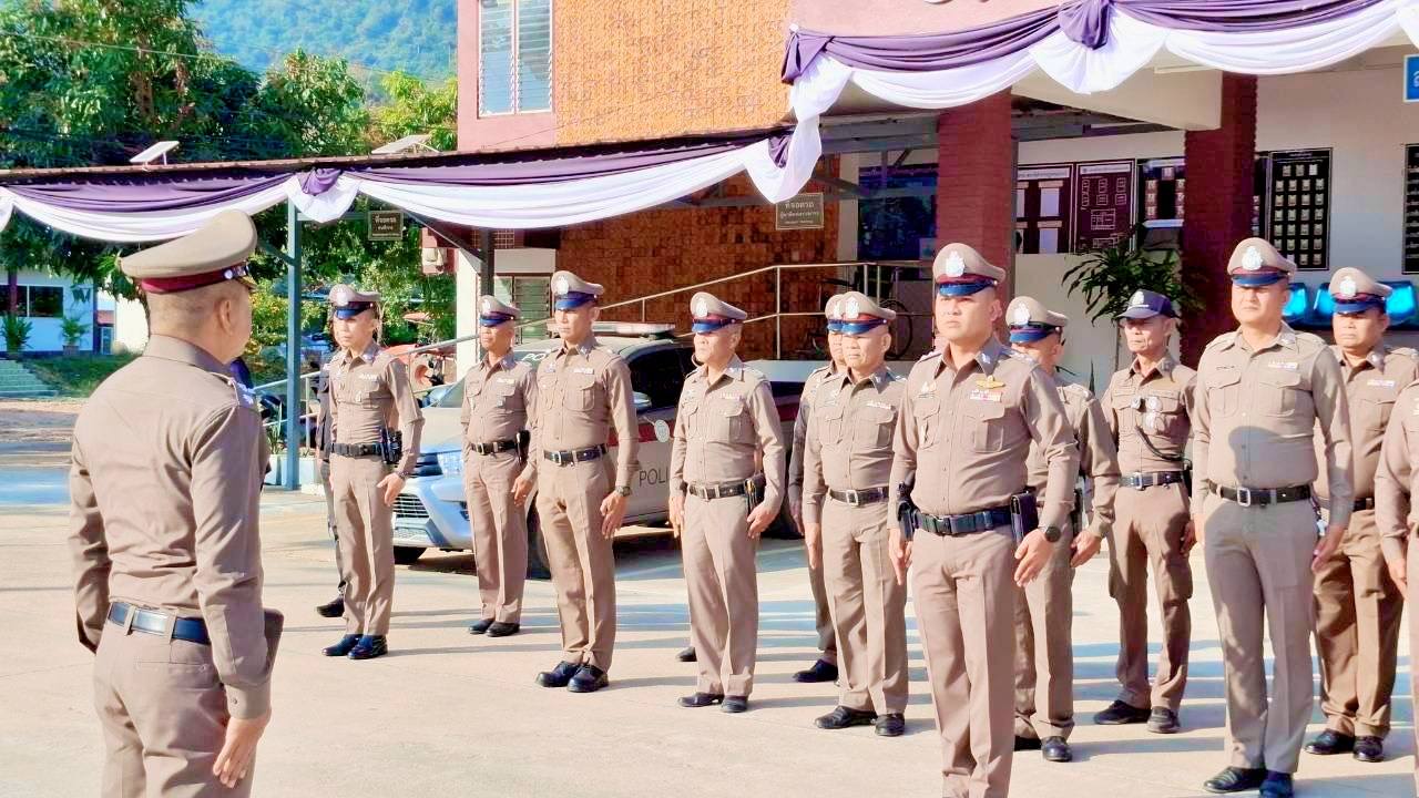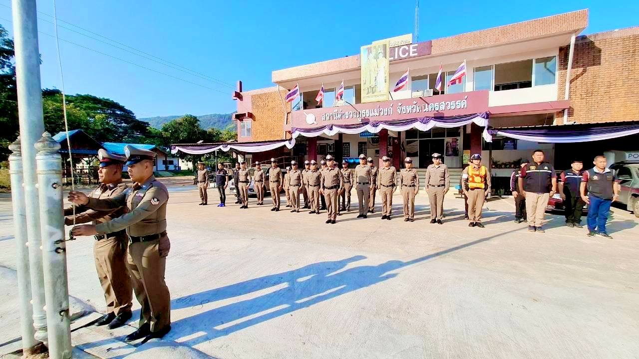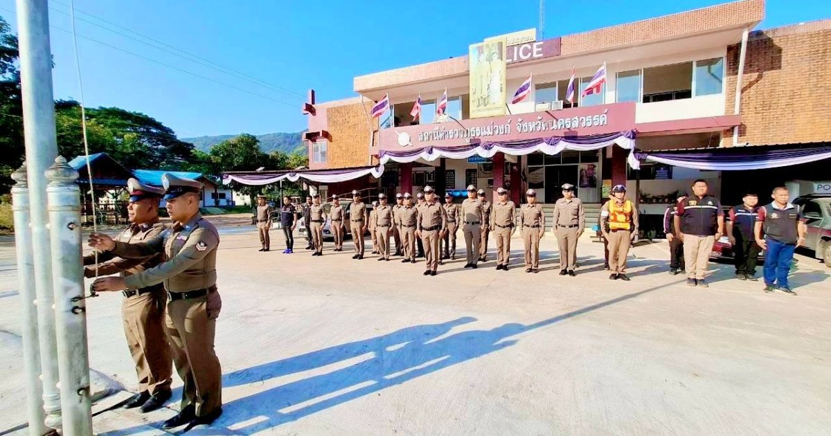 พ.ต.อ. วุฒิชัย ทองงามขำ ผกก.สภ.แม่วงก์ นำข้าราชการตำรวจ เข้าแถวเคารพธงชาติ สวดมนต์ กล่าวอุดมคติตำรวจ พร้อมตรวจเครื่องแบบ ทรงผม